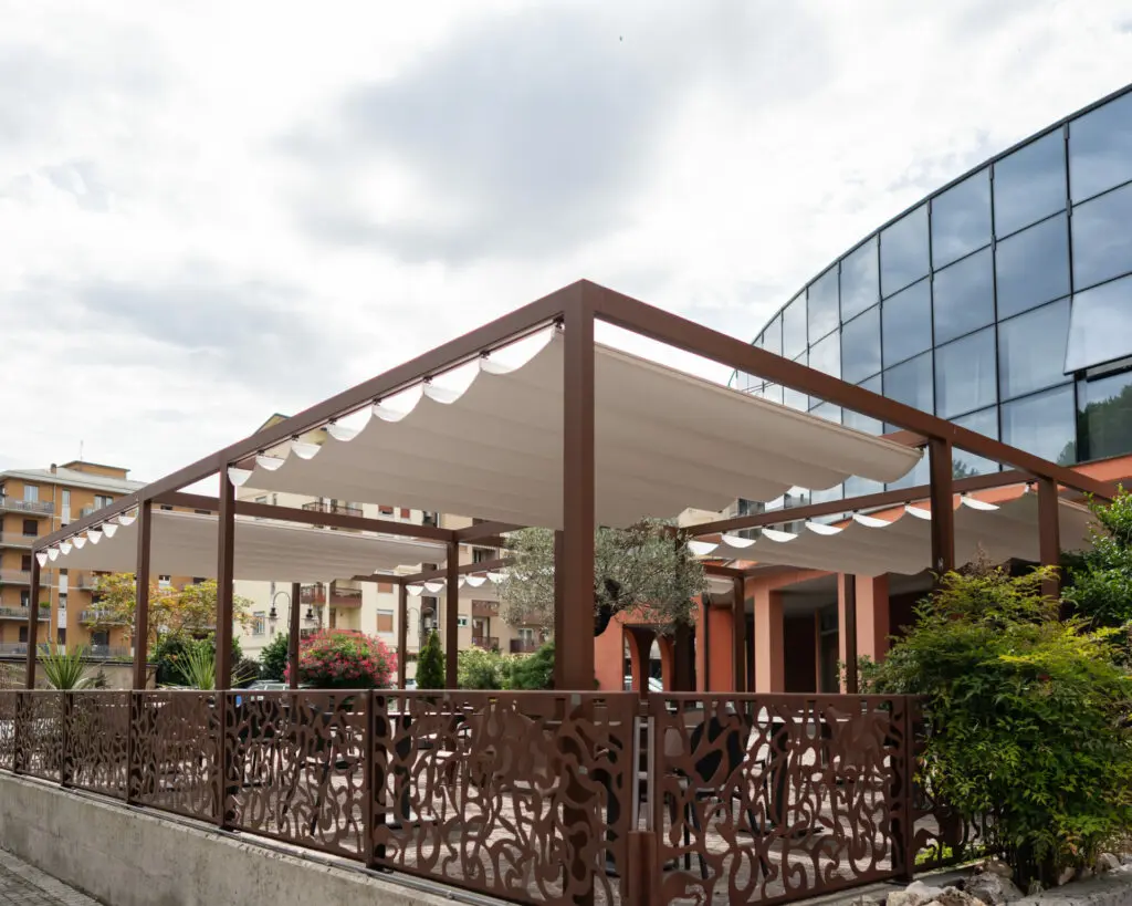 Tende pergole a scorrimento. La Pergotenda è la soluzione ideale per trasformare il vostro spazio esterno in un ambiente riparato, elegante e di design, offrendovi la possibilità di arredarlo con stile e funzionalità. Grazie alla sua versatilità, questa struttura si adatta perfettamente a qualsiasi contesto abitativo o commerciale, creando un luogo accogliente che può essere utilizzato tutto l’anno. Le Pergotende fissate alla facciata, ad esempio, offrono un riparo ottimale dal sole e dagli agenti atmosferici, permettendo di regolare l’intensità della luce negli ambienti interni ed esterni, per un comfort personalizzato.